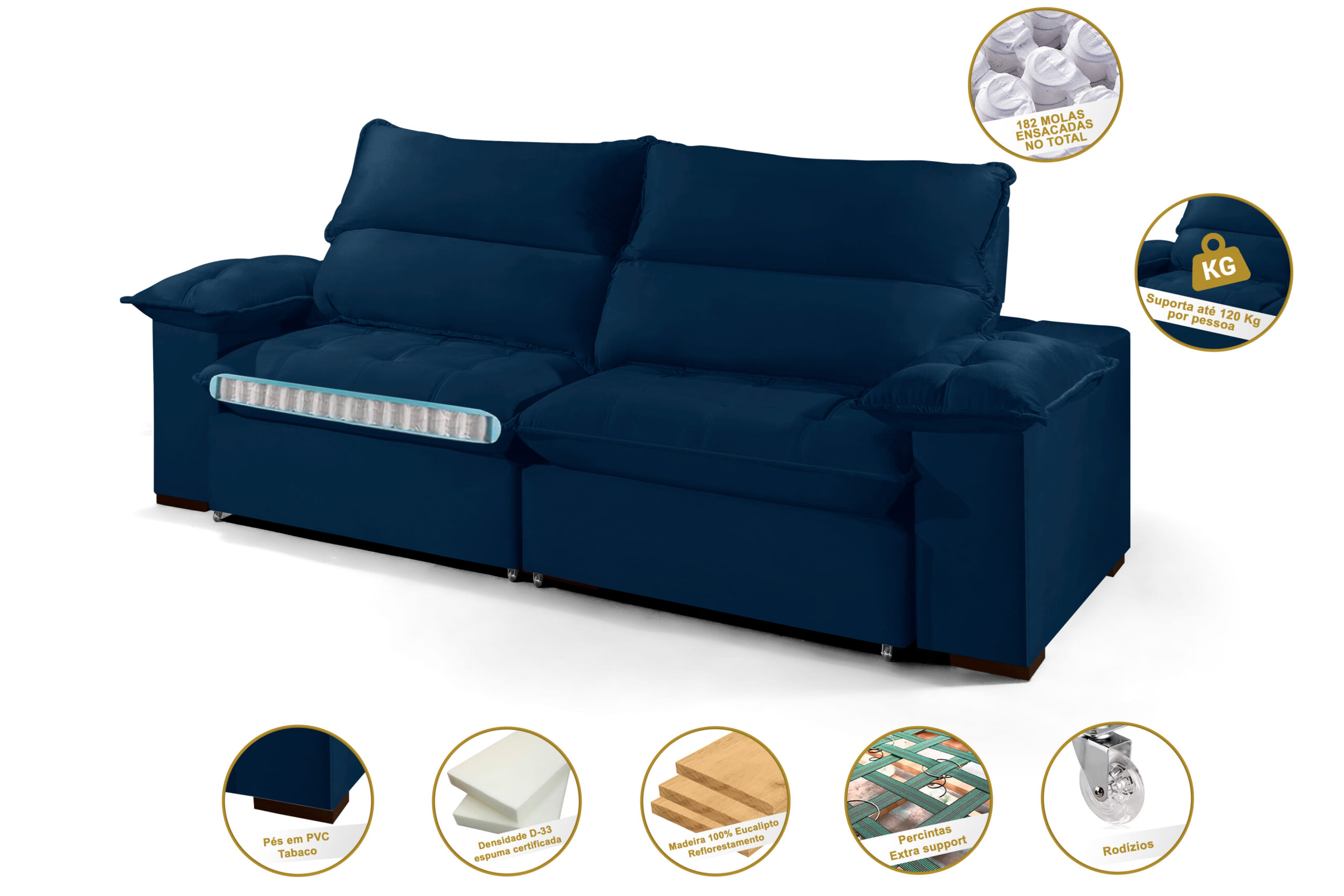 • Assento retrátil em espuma D-33, sustentação com cintas elásticas de alta resistência, molas ensacadas, corrediças metálicas tubulares com pillow de 20 cm.
